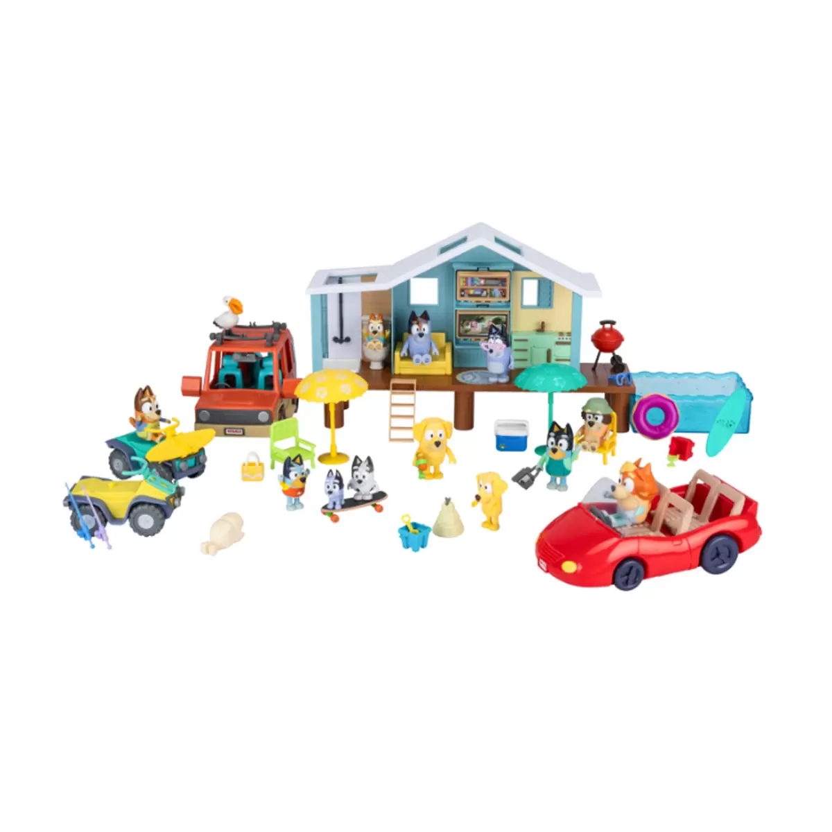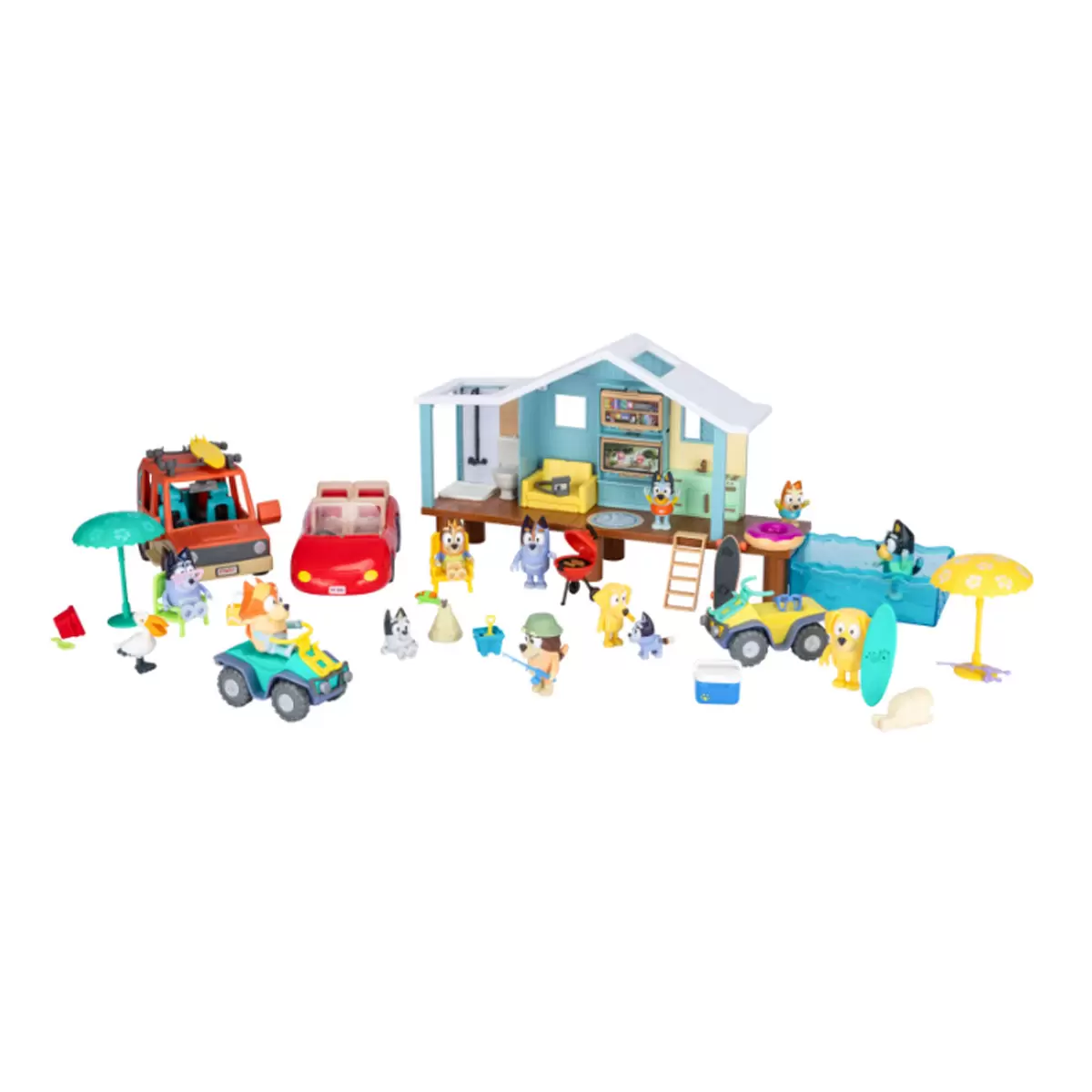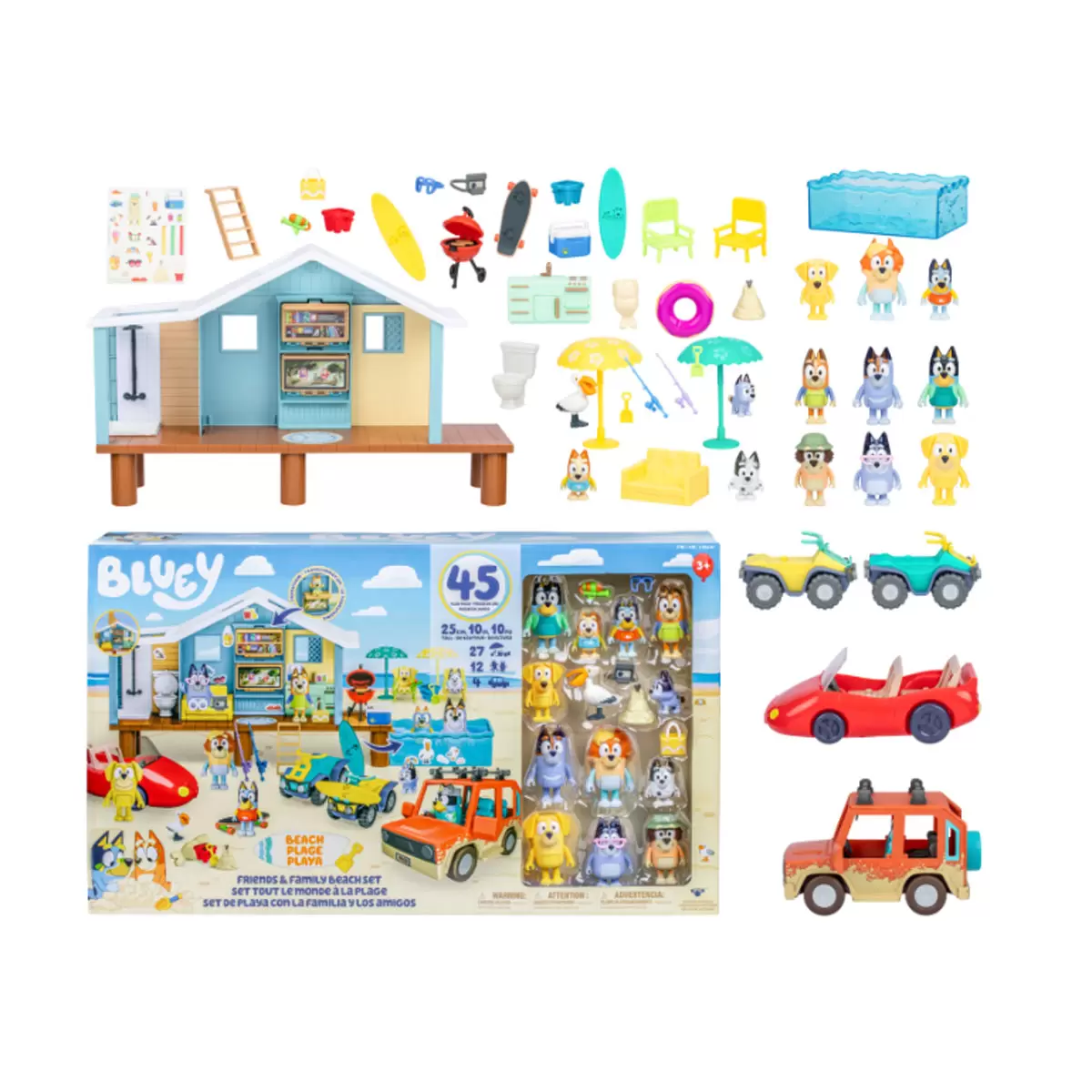 Bluey Mega Beach Bash Exclusive set 45 pieces – 45-piece set featuring Bluey’s Beach Cabin playset (25cm wide), 4 vehicles, and 12 figures for endless beach adventures. Includes quads, a Land Cruiser, and a convertible for fun-filled exploration!