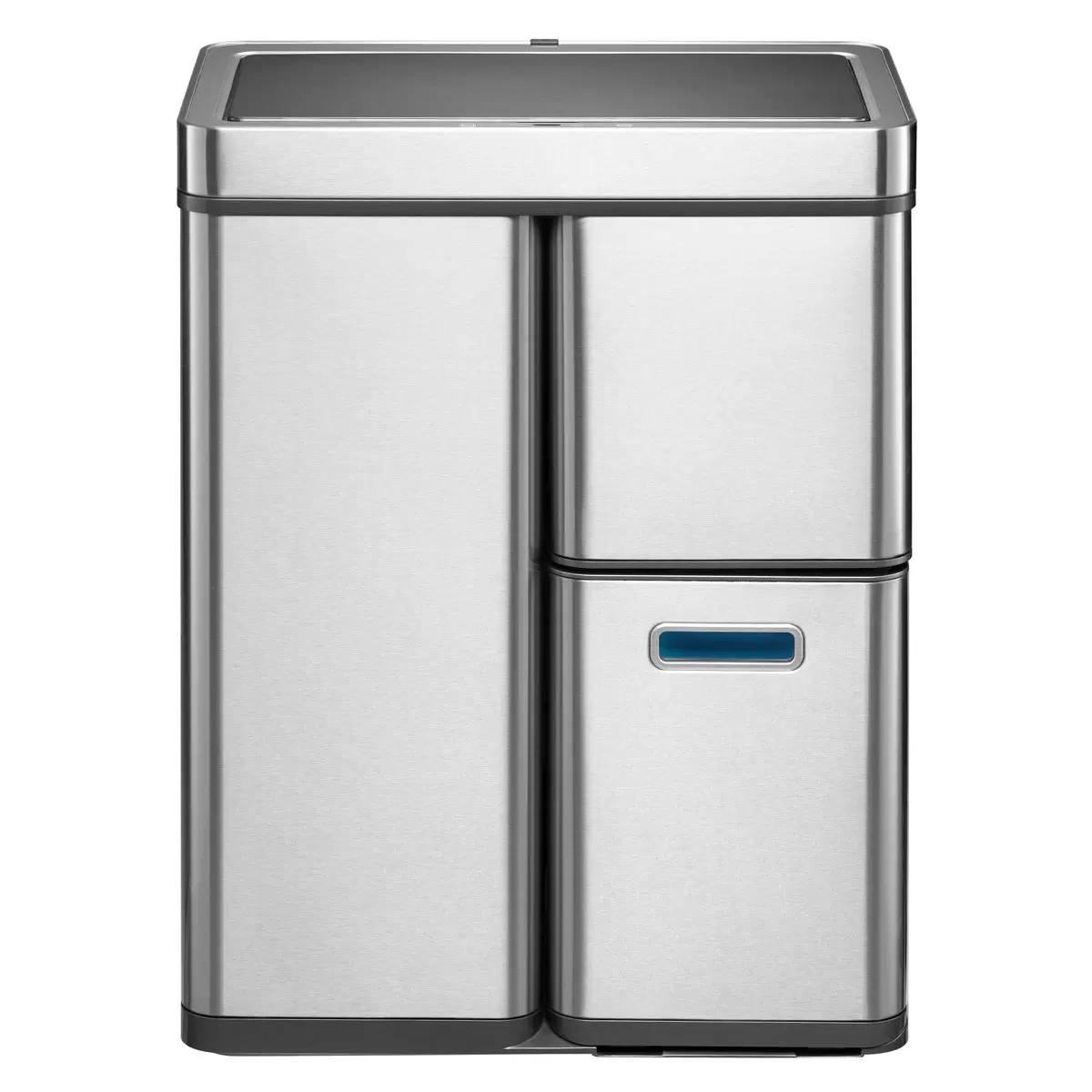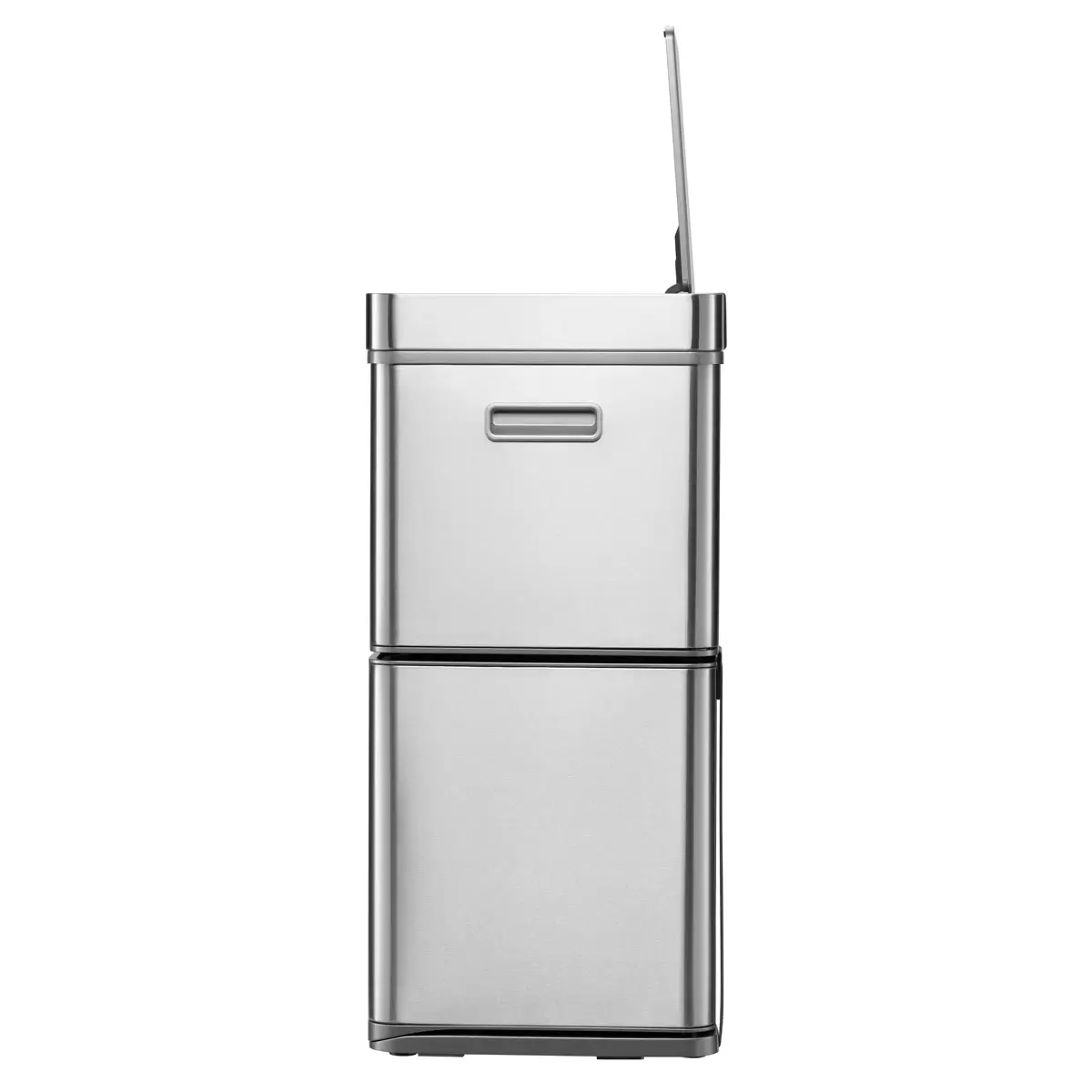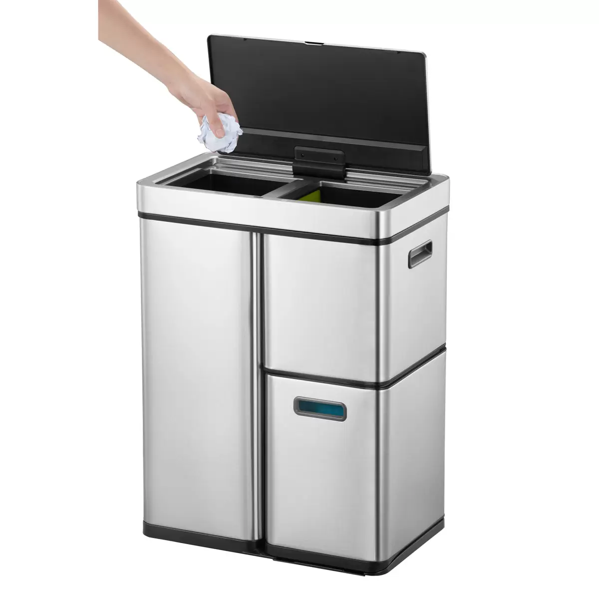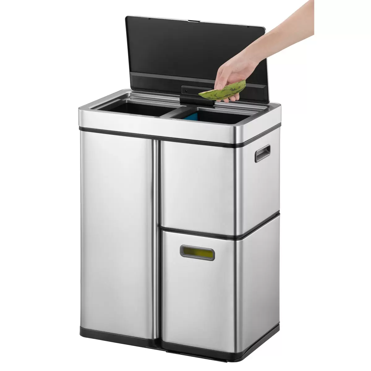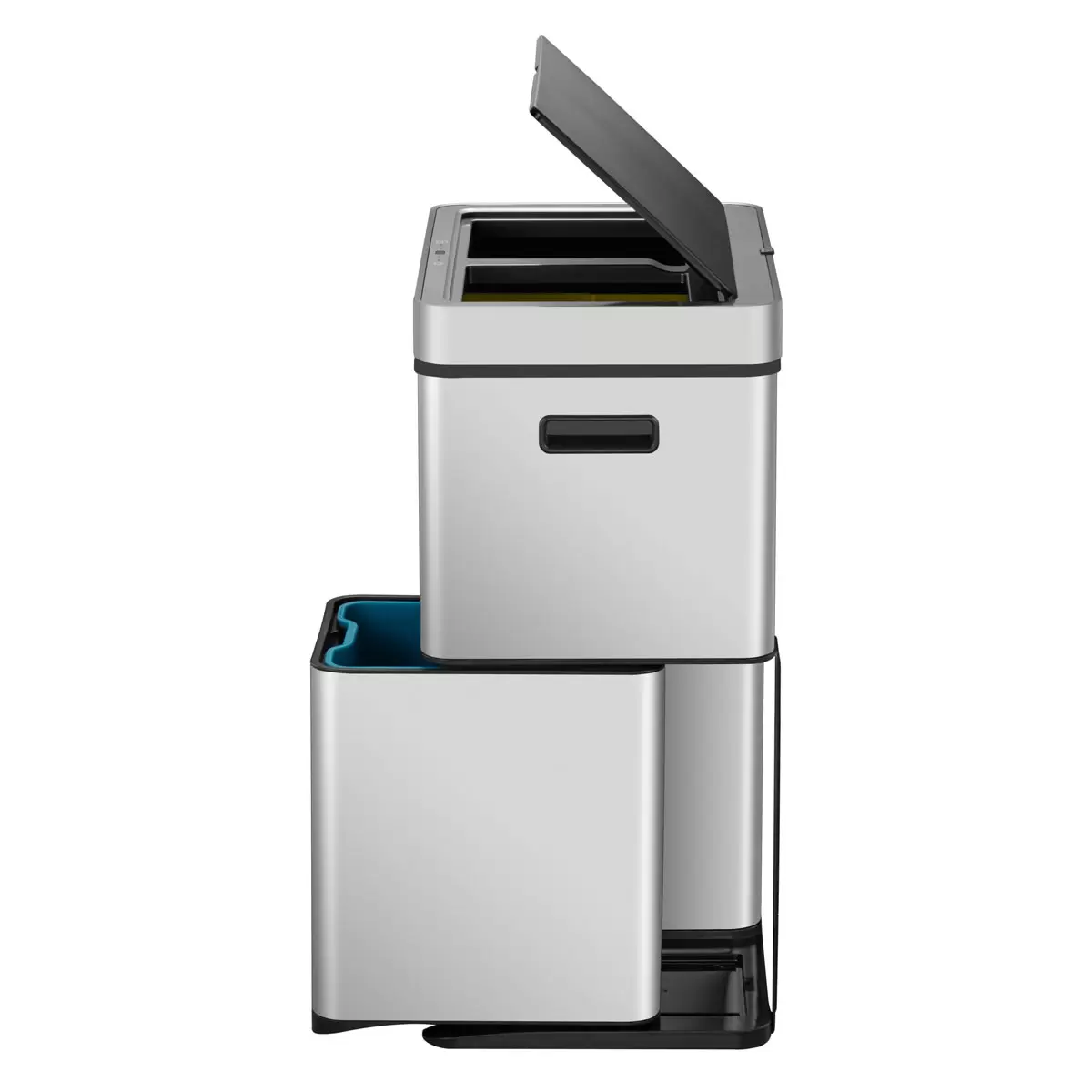 EKO Mirage Plus Recycling Bin 30+15+15L – Stylish brushed stainless steel bin with fingerprint-resistant finish, motion sensor hands-free lid, soft close, and manual stay-open mode for effortless, hygienic waste sorting.