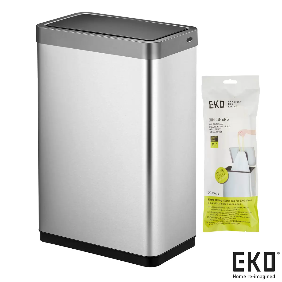 Experience touch-free convenience with the EKO Mirage X-Sensor Stainless Steel Sensor Bin 20+20L. Features an interactive motion sensor for hygienic operation, bin bag fixer for any liner, deodoriser compartment for EKO perfume capsules, includes F-1 liners, and comes with a 3-year warranty.