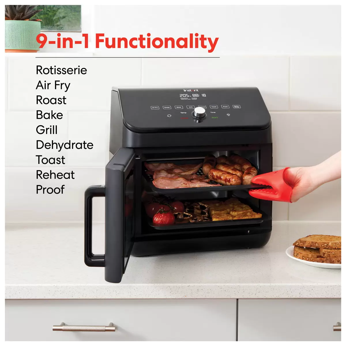 Multiple ways to cook a speedy weekday meal – you can Air Fry, rotisserie, roast, grill, bake, toast, reheat, plus bonus dehydrate & proofing functions too!