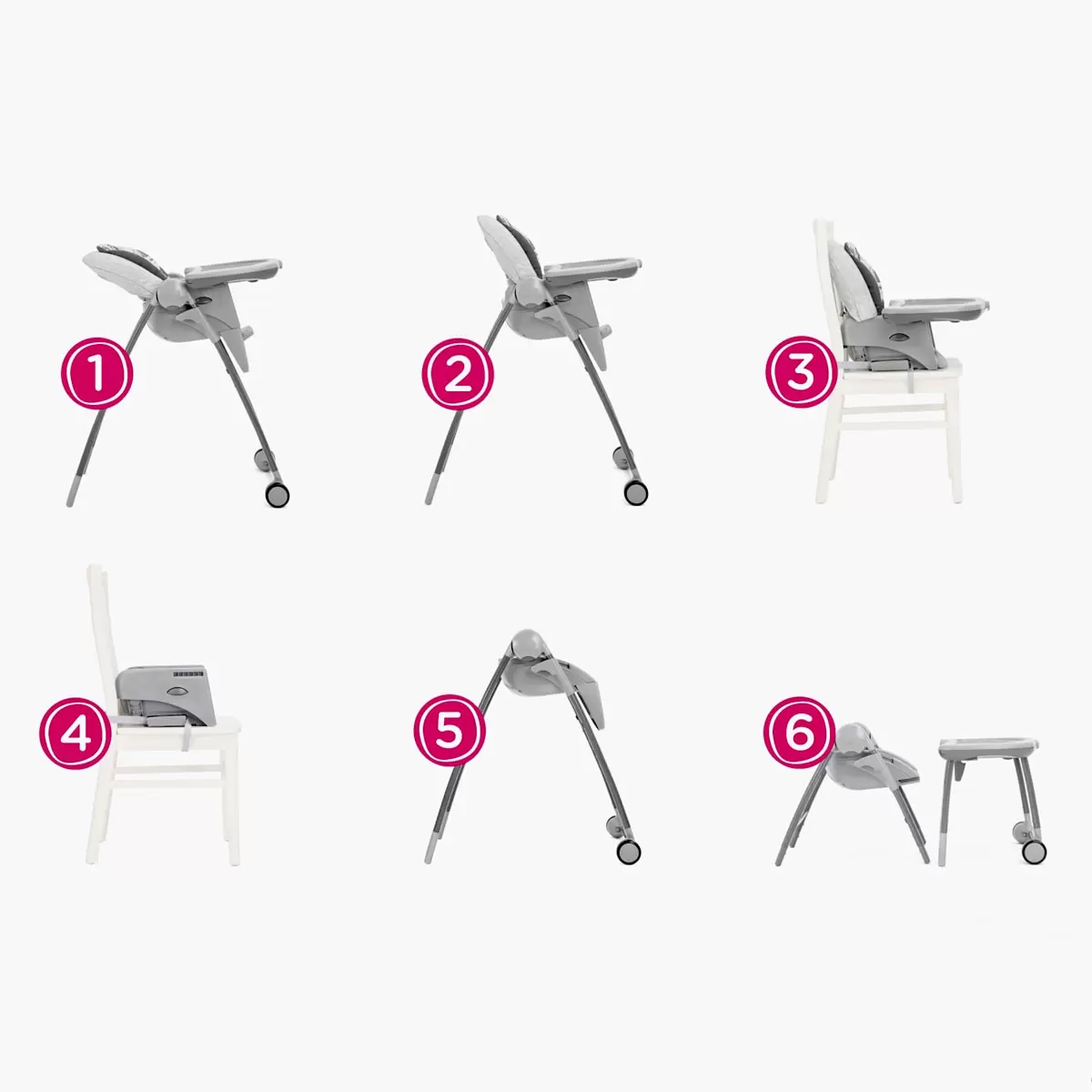 - Six versatile modes: baby highchair, traditional highchair, booster, portable booster, toddler chair, and play table