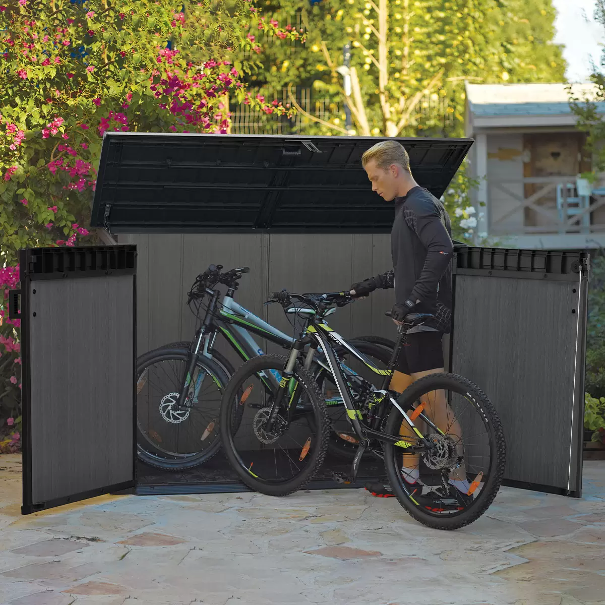 The Cortina Mega Store is perfect for accommodating your larger outdoor items such as garden furniture, equipment and two 360 litre or three 240 litre wheelie bins and includes adjustable brackets to add in a wooden shelf (not included) to further expand your storage options – a perfect solution for storing smaller, everyday items.