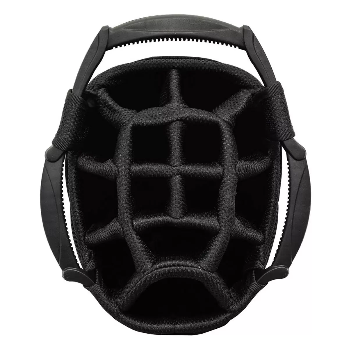 The 14-way divider top with an oversized putter well ensures excellent club organization and protection. For added convenience, it includes three grab handles for effortless lifting, a trolley strap holder, and a trolley-friendly base for a secure fit on any cart. Additional features include a rain hood, umbrella and towel holders, and a padded adjustable single strap for comfortable carrying.
