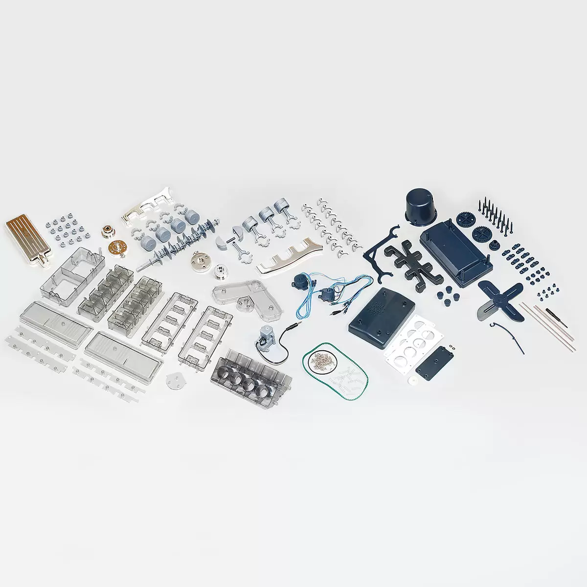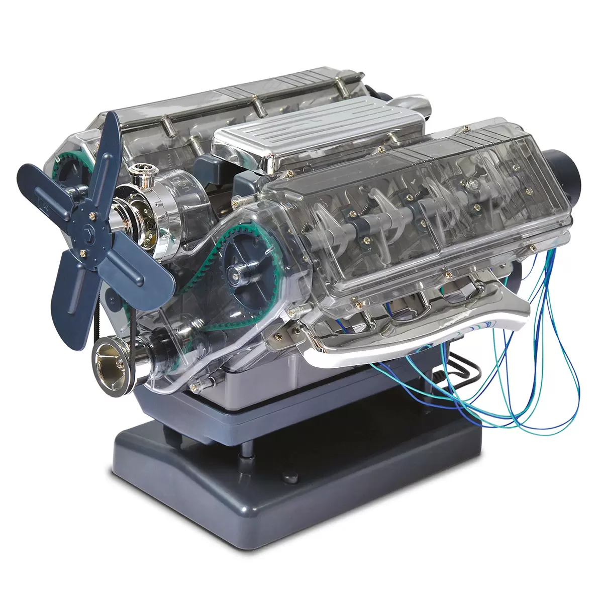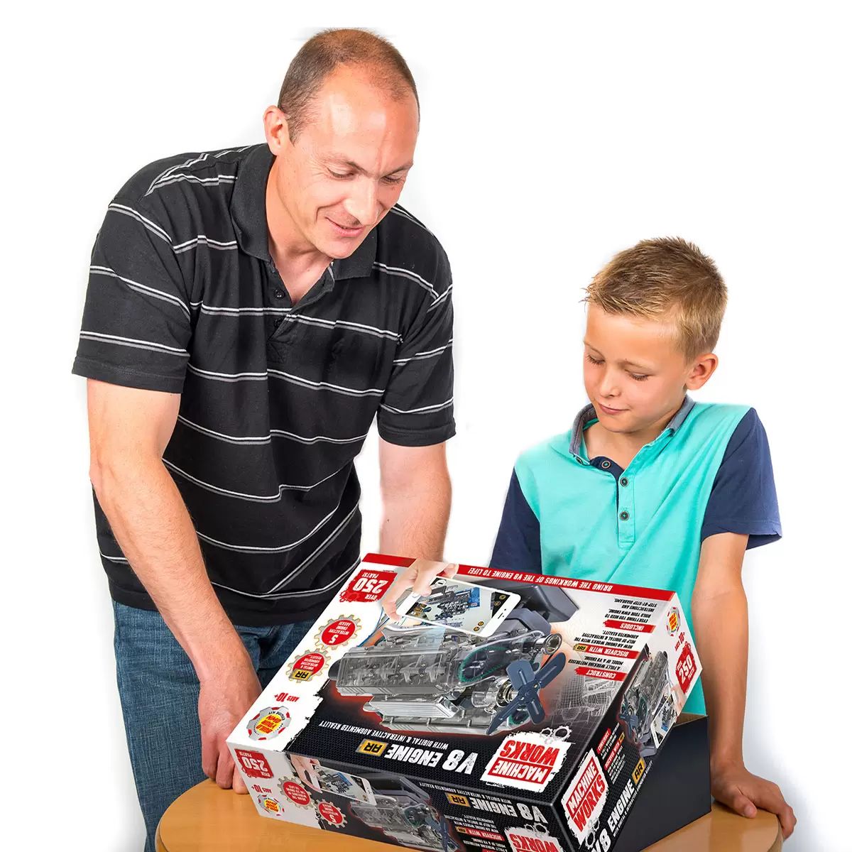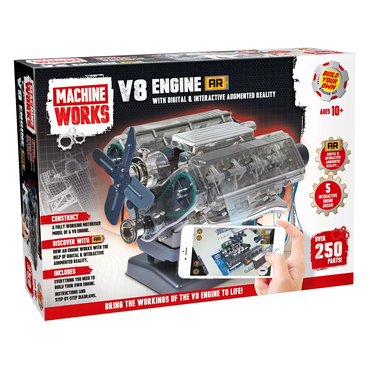 Build a fully functional, motorised model of a V8 petrol engine. This model is a greatly simplified version of a real V8 car engine featuring realistic V8 sound and illuminating spark plugs. Contains over 250 pieces and all that you need to assemble the model. Comes with a manual giving you step by step instruction as well as interesting information about V8 engines. To help you discover how internal combustion engines work a special augmented reality App is available via your smart phone. This creates an interactive experience with the finished model so you can see an exploded view of the engine with 5 animations of key components and detailed descriptions of 11 different engine parts plus the engine sound. Brings the workings of the V8 engine to life! Kit includes free access to the App, accessible from both the Apple and Google Play Stores.