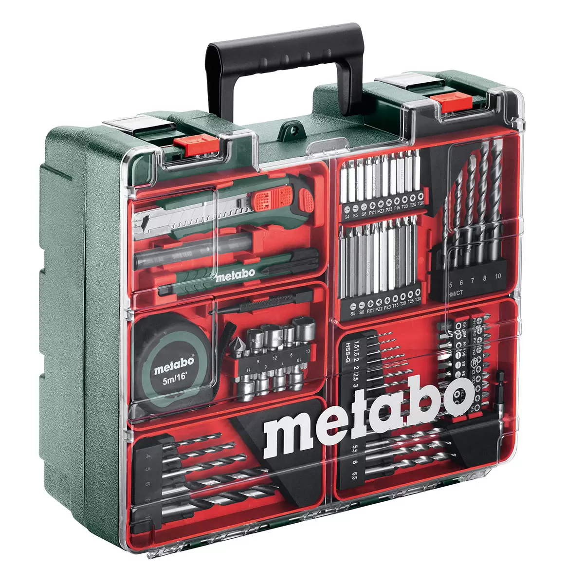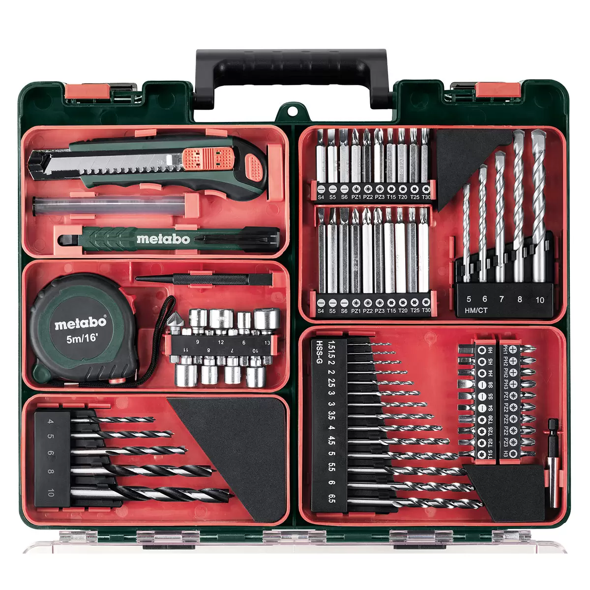 This set also includes an array of accessories from assorted screwdriver bits, masonry and wood drill bits, a tape measure and box cutter which are all stored in a handy carry case for safe keeping.