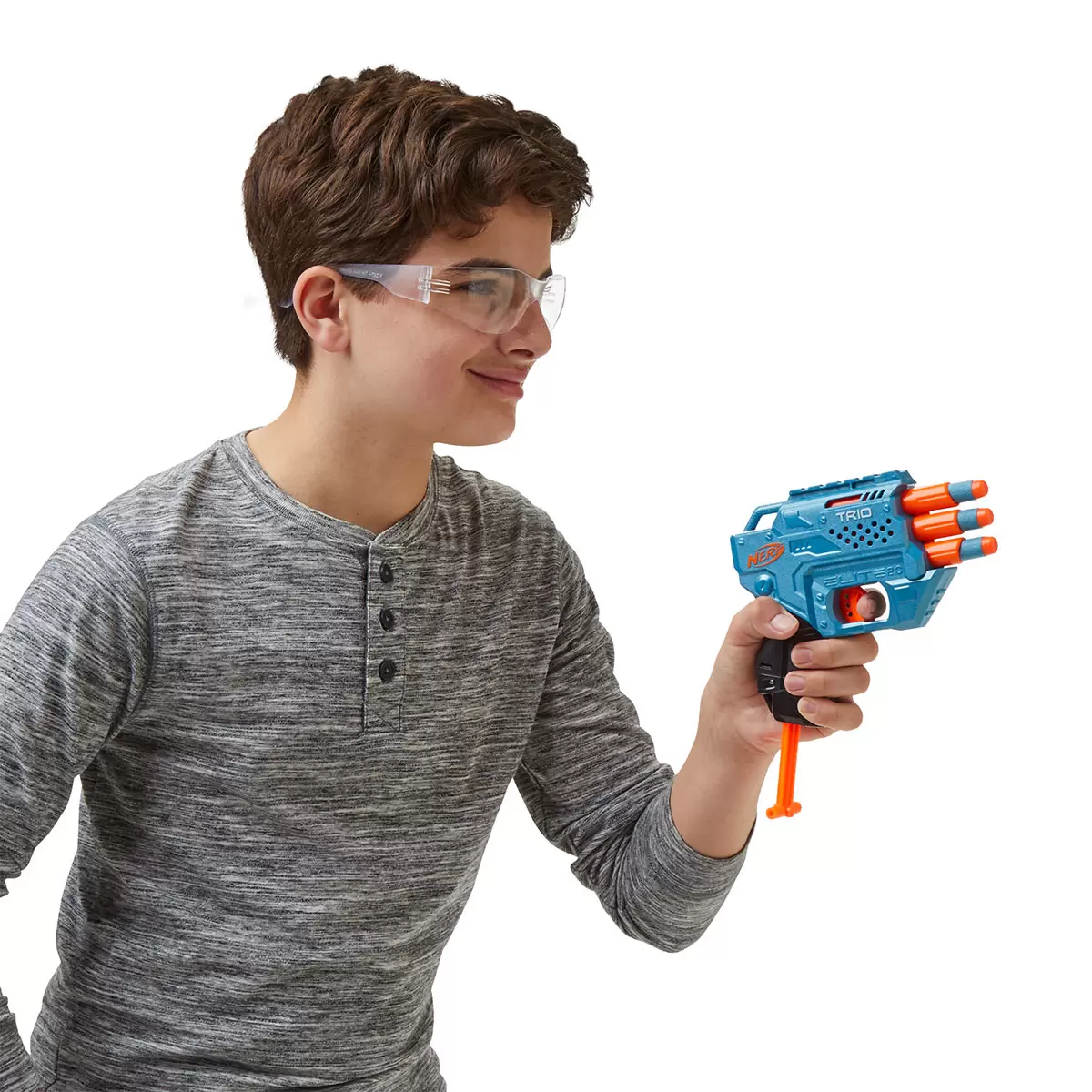 It’s a great gift set for anyone new to Nerf dart games and for Nerf fans building their blaster collection. The Eaglepoint RD-8 blaster features an 8-dart rotating drum, unleashes 8 darts in a row with bolt-action priming, and has onboard dart storage, 3 tactical rails, and a barrel attachment point for the barrel. The Tetrad QS-4 blaster features 4-dart blasting, fires 4 darts in a row with pump-action priming, and has a tactical rail. The Trio TD-3 blaster launches 3 darts in a row and has a tactical rail. Attach the scope to a tactical rail on any of the 3 blasters to customize for every mission or battle. Eyewear recommended (not included).