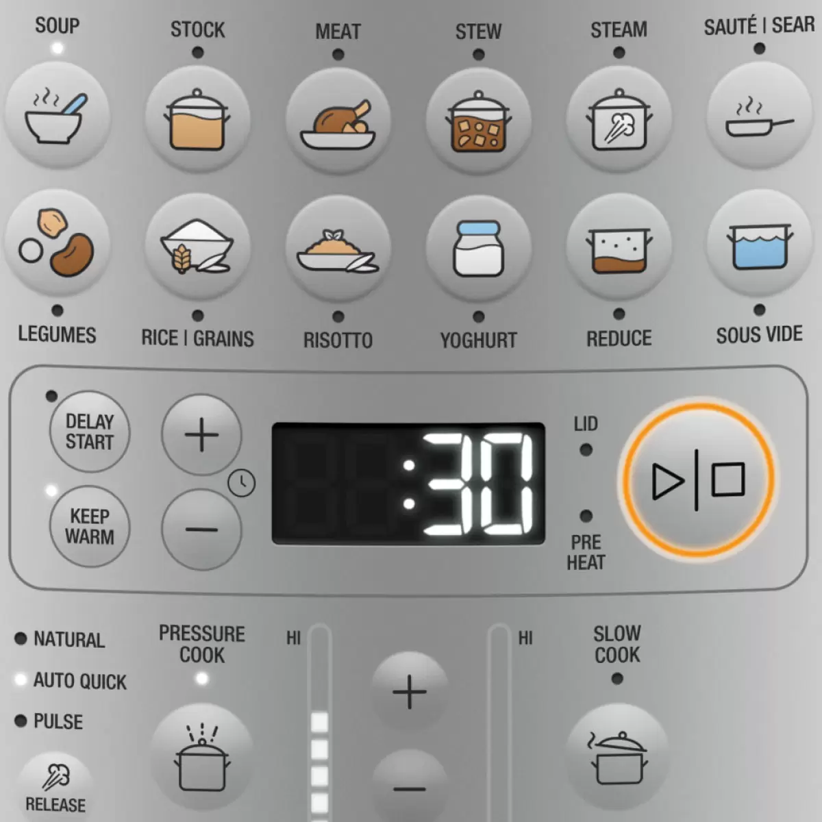 With 14 shortcuts and appliance settings at your fingertips. Including; Soup, Stock, Meat, Stew, Steam, Sauté, Legumes, Rice/Grains, Risotto, Yoghurt, Reduce, Sous Vide.