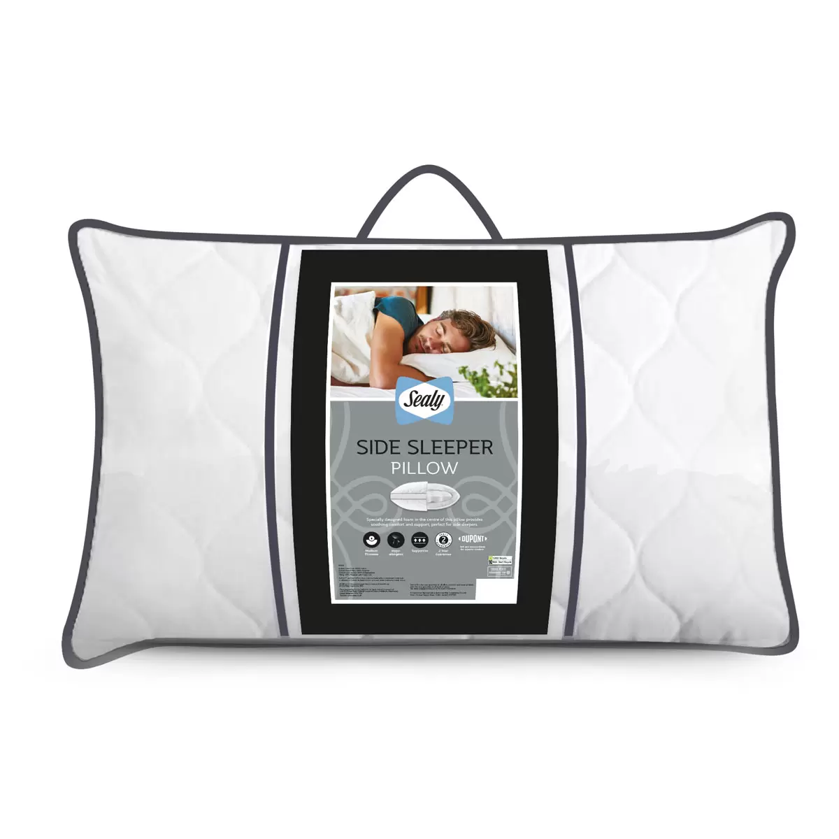 The Sealy Side Sleeper Pillow combines long-standing craftsmanship with the latest innovations. The deeply supportive foam centre helps to encourage the neck and spine to remain in a straight and neutral position for ultimate comfort and posture support while you sleep. The foam comfort layer is ventilated to encourage air to move around the pillow to keep you fresh and comfortable. DuPont™ fibres surround the foam centre and offer soft and bouncy superior comfort.