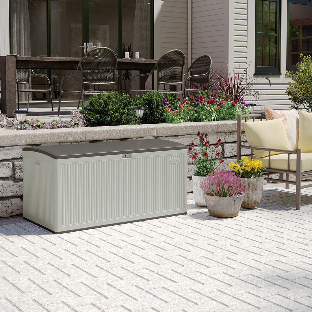 This deck box features a soft-close lid, that prevents the deck box from closing too quickly and slamming shut. The pad-lockable metal latch ensures your belongings stay secure. The decorative reeded modern design is sure to enhance any outdoor décor.