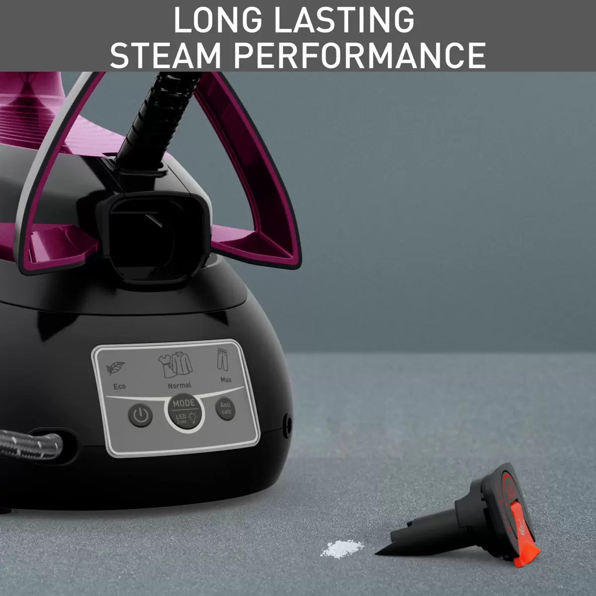 Maintenance is simple thanks to the removable Scale Collector, which prevents limescale build-up and ensures long-lasting steam performance. Just remove the collector, rinse it, and slide it back in.