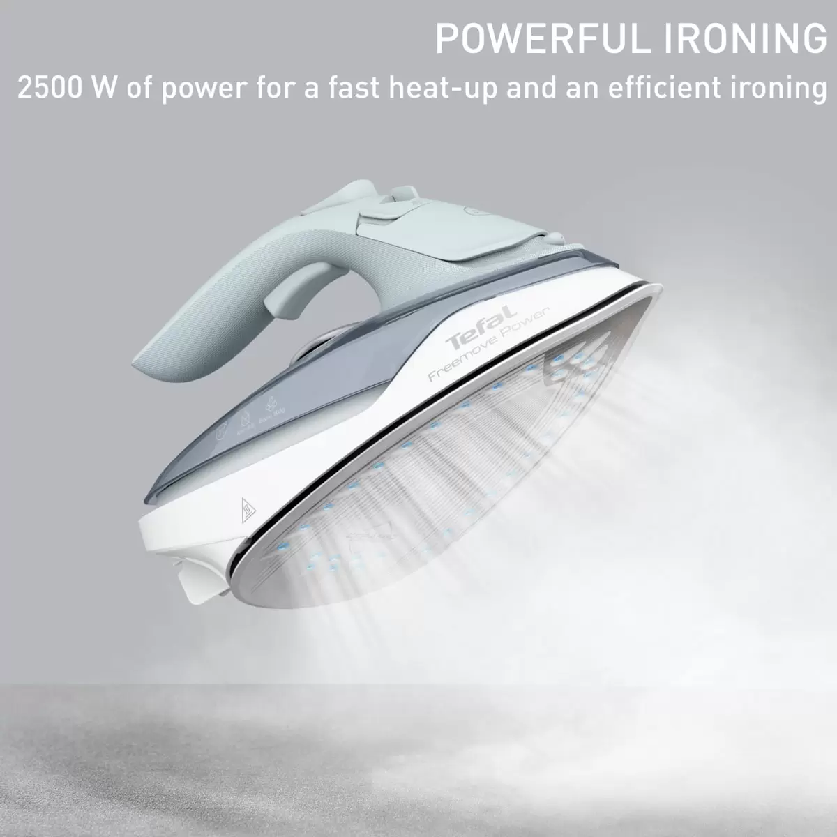 Tefal Freemove Power Steam Iron FV6642G0 with 2500W power, cordless design, fast 30-second heat-up, anti-drip protection, and easy vertical steaming.