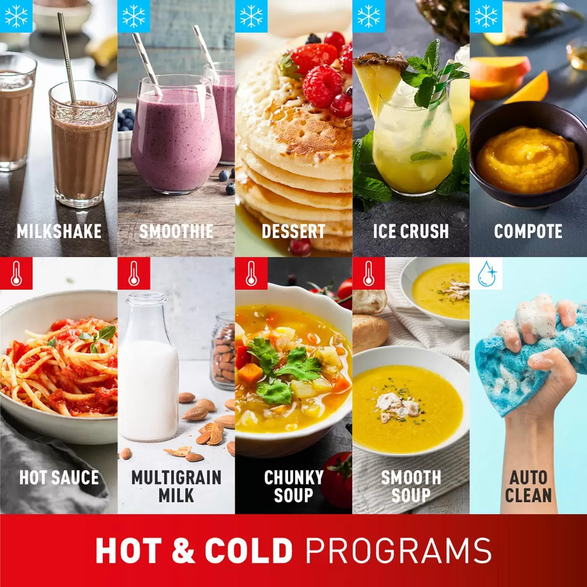 Tefal PerfectMix Cook Blender and Cooker in Stainless Steel BL83SD65, the high-speed blender that cooks. More than a smoothie maker, this multitalented blender cooks sauces, jams, and more from scratch. 10 automatic programs – four cold and six hot – do all the work. Choose a program and press start, or set your own speed, time and temperature. Blend ice-cold shakes, desserts and frozen coffees; cook and blend homemade compotes, smooth soups and hot sauces, or cook chunky soups, dips and hearty stews. Then serve your hot creations straight from the jug – no need to reheat. You can even make your own multigrain milks. Just add 100g of soya beans (no soaking needed) to 1L of water for homemade soya milk in 30 minutes. There’s also a basket accessory to turn your blender into a steamer. Top tip: steam then blend in manual mode to make your own baby food. You’ll know exactly what’s in it, and save some pennies. Six high-performance Powelix blades propelled by a 1400W motor give you smoother results up to 30% faster.
