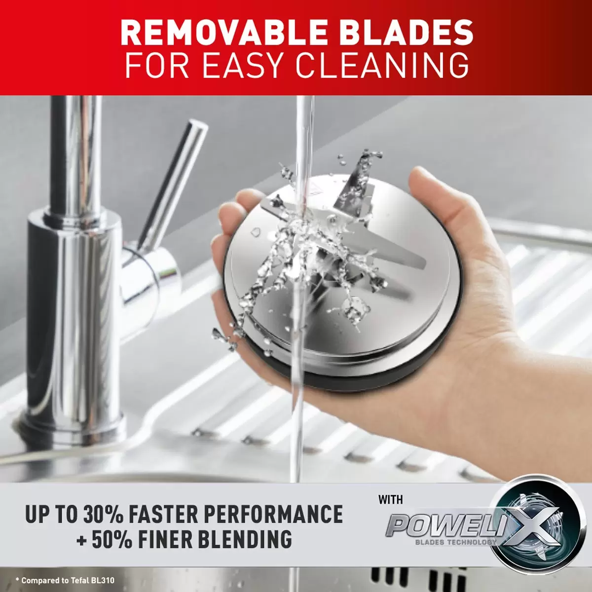 Touch controls make it intuitive to use, and the family-sized 1.75L glass jug is both heat and stainproof. Clean-up is easy too as the automatic cleaning program rinses the jug for you, killing 99.9% of bacteria, and the blades lift out – use the brush to clean around them safely. The hardest part will be deciding what to make. Find infinite recipes on the free Tefal app.
